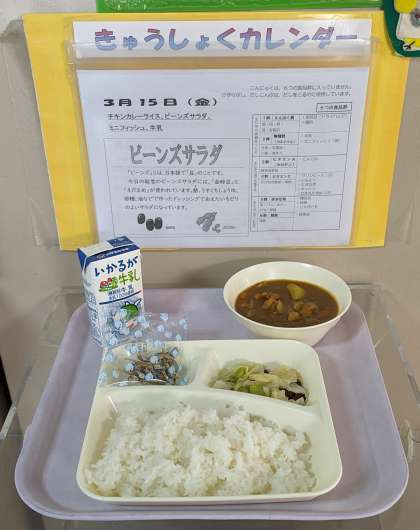 チキンカレーライス ビーンズサラダ ミニフィッシュ ごはん 牛乳