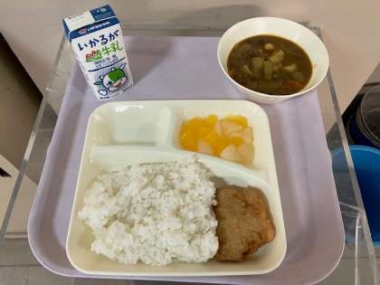 今日の給食は、カツカレーライス、牛乳、フルーツゼリー、です。