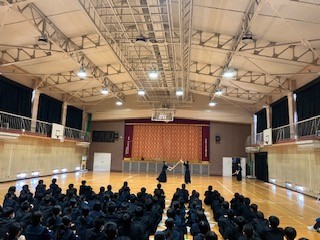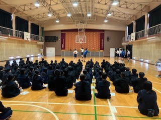 4月9日(水)、2・3年生は5時間で授業が終わりました。1年生にクラブの紹介をするため、関係する生徒は講堂に集合しました。日頃の行っている活動内容を紹介し、自分たちの練習の成果を披露しました。1年生は先輩達の披露する姿を見て、どのクラブに入るか、悩んでいました。