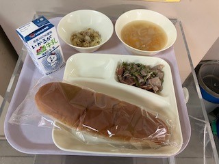 今日の給食は、黒糖パン、牛乳、豚肉のガーリック焼き、スープ、ツナとキャベツのソテー、です。