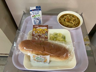 今日の給食は、コッペパン、アプリコットジャム、牛乳、カレースープスパゲッティ、キャベツのピクルス、おさつチップス、です。