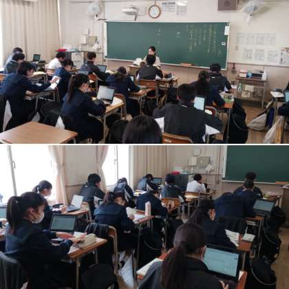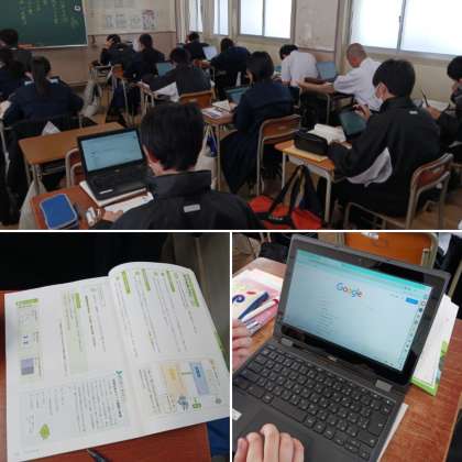 2年生国語の授業です。先生に指示された課題をクロムブックを用いて調べています。みんな集中して学習しています。