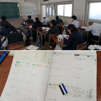 2年生の数学の授業の様子です。「式と計算」を学習しています。練習問題を多く解いています。