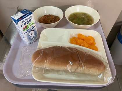 今日の給食は、黒糖パン、牛乳、じゃがいものミートグラタン、レタスのスープ、みかん(缶)、です。