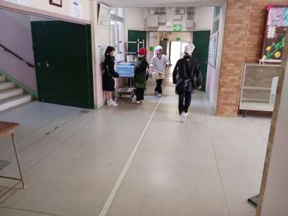 給食の準備の様子です。2年生の様子です。楽しみにしている給食の時間です。当番の生徒が配膳をしてくれています。