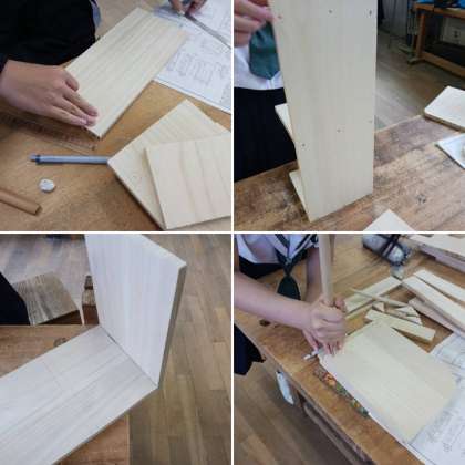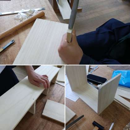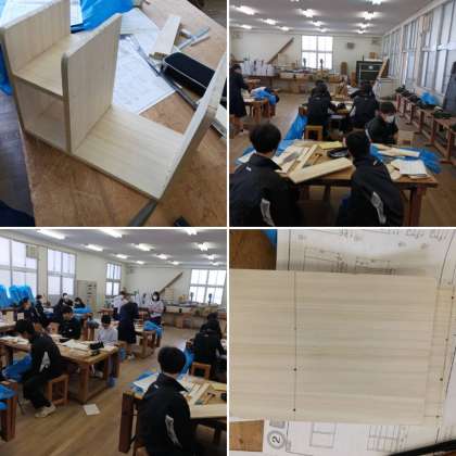 2年生の技術の様子です。授業は昨日に続いてイージーラック作成をしています。早い班は側板、底板等の接合作業を行っています。
