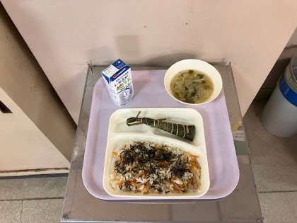 給食の給食は、ごはん、牛乳、きんぴらちらし(具)、きざみのり(袋?きんぴらちらし)、すまし汁、ちまき、です。