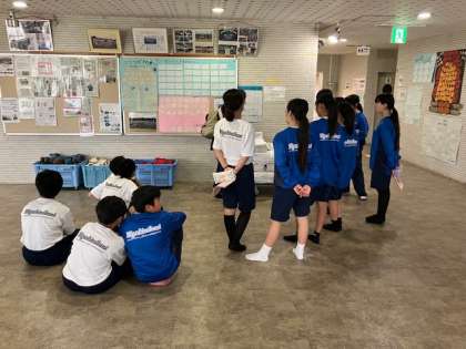 係の打ち合わせです。室長?食事?シーツ?入浴?保健係の生徒がそれぞれの指示された場所に移動して、担当の先生から説明を受けています。