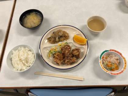 今日の夕食は、ごはん、みそ汁、唐揚げ、サラダ、春雨の炒め物、酢の物、オレンジ、です。