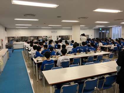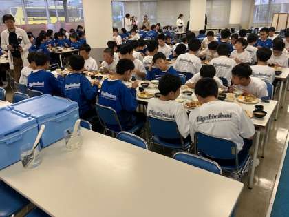 代表生徒が「いただきます!」のあいさつをしてくれました。クラスメートと食べる夕食は、また格別です。みんなニコニコしています。たくさん食べてください。この後も取組があります。