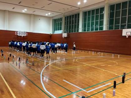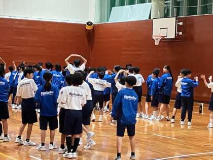 「ヒガリンピック」2つめです。「人類みなきょうだい」。見ただけでは並んでるだけですが、しゃべったり、口パクもなしで、黙って誕生日順に並んでいます。クスクス笑う声だけが体育館に響いています。最後の人が完了の合図をしています。