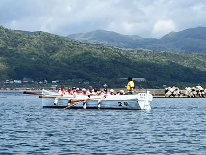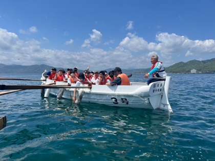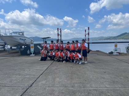 B班のカッター活動の様子です。ライフジャケットを着用して記念撮影。みんなで力を合わせてカッターを進めています。