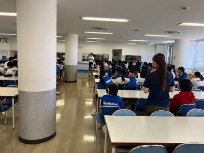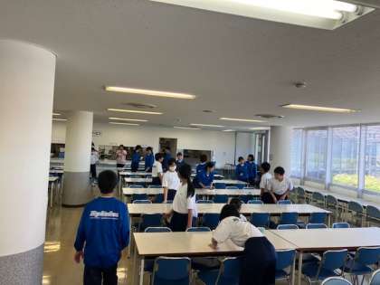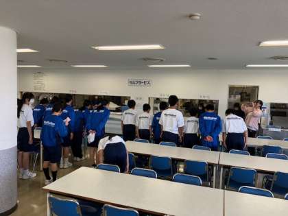 最後の昼食後の食事係さん達です。皆さんのお仕事のおかげで、気持ちよく食事が取れました。また、最後に食堂の調理員さんにもお礼を伝えました。2日間、おいしい食事をありがとうございました。