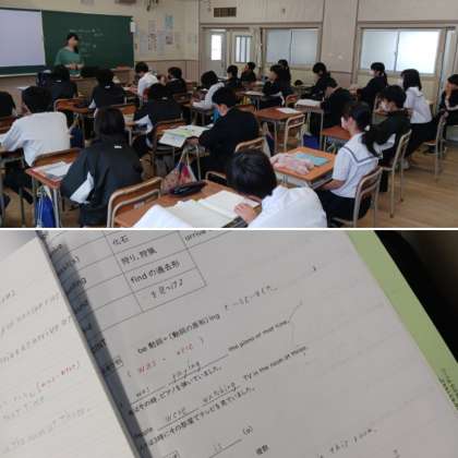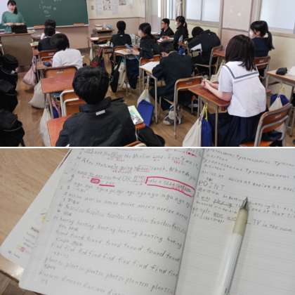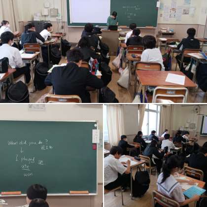 2年生の英語の授業の様子です。今日は過去形について学習しています。英語で尋ねられたことに、自然に英語で答えています。