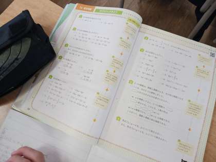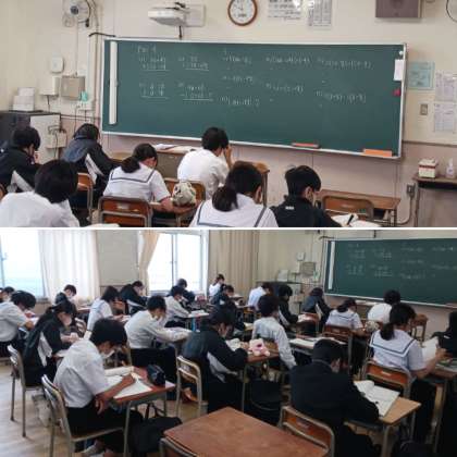 2年生の数学の授業の様子です。10日(金)から始まる中間テストにむけて、みんな一生懸命学習に取り組んでいます。この時間は、単元の総まとめ、章末問題に取り組んでいました。