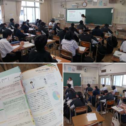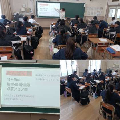 2年生の家庭科の授業の様子です。先週に引き続き、栄養素について学習しています。先生が作った「たんぱく質」についての説明のパワーポイントをしっかり観察していました。人間の成長に必要不可欠な成分の学習ですね。