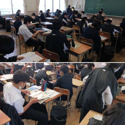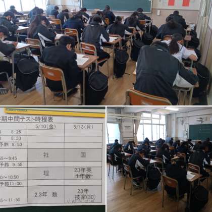 今日から中間テストです。テストを控えた2年生の教室の様子です。テストに向けて最終調整をしています。テストに取り組む姿勢はとても良いですね。今日は社会、理科、数学のテストが実施されました。終了のチャイムがなるまで集中してテストに臨んでいました。テストが終わったら、授業で取り組んだノートやプリントを提出してから下校となります。