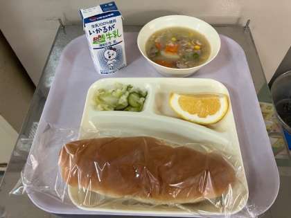 今日の給食は、黒糖パン、牛乳、鶏肉とコーンのシチュー、キャベツときゅうりのサラダ、かわちばんかん、です。