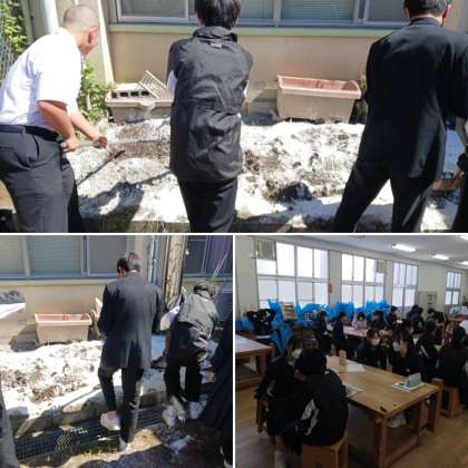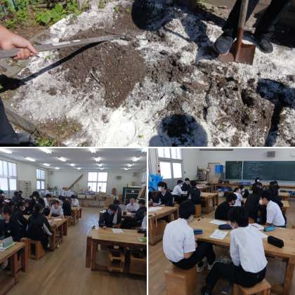 2年生の技術科の授業の様子です。先週より生物育成の技術について学習しています。今日から本格的に実習に入りました。畑に石灰をまいて寝かせます。どうなっていくのでしょうか?