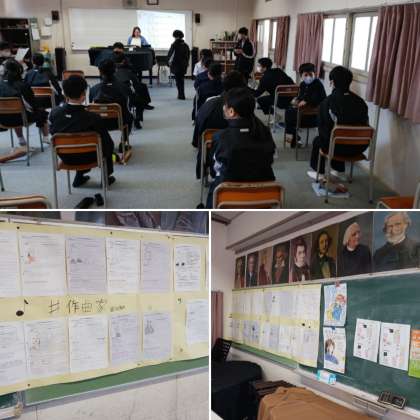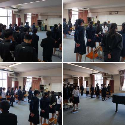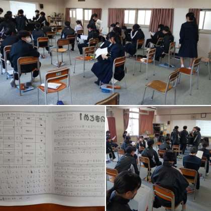 2年生の音楽の授業の様子です。提出物の返却と音符についてのプリント配布の後、発声練習や課題曲の練習が行われています。来週の歌の発表の練習に取り組んでいます。