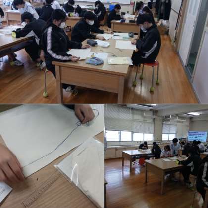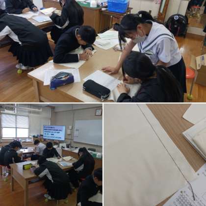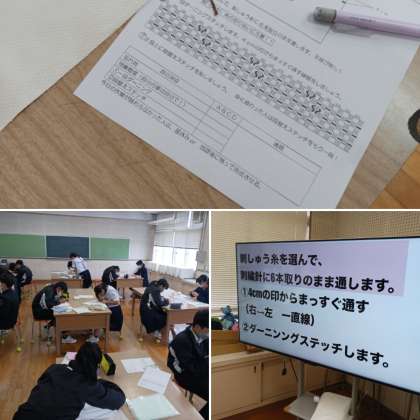 2年生の家庭科の授業の様子です。今日の授業では「スウェーデン刺繍」について学習しています。細かい部分について先生からアドバイスをいただいています。