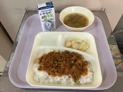 今日の給食は、タコライス、牛乳、もずくのスープ、焼きじゃが、です。