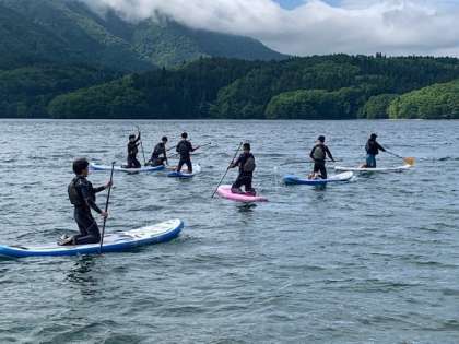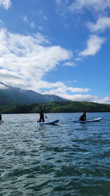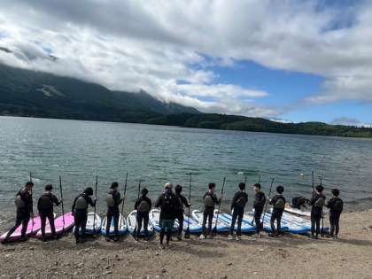 アクティビティ、SUPです。SUPとは「Stand Up Paddleboard(スタンドアップパドルボード)」の略です。サーフボードの上に立って、一本のパドルを交互に漕いで海などの水面を進んでいくアクティビティです。インストラクターの方から説明を受けて、Surf's upです。