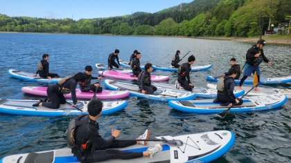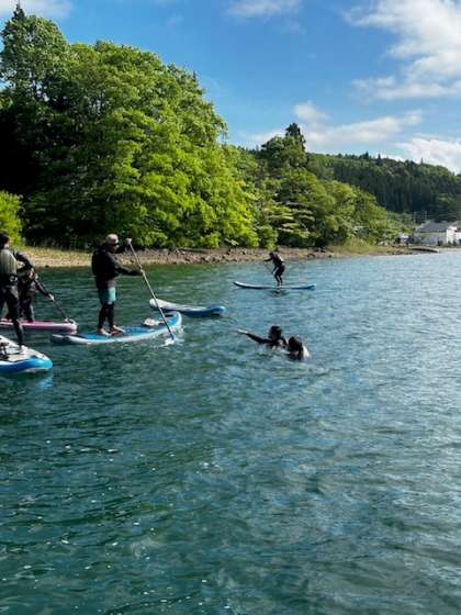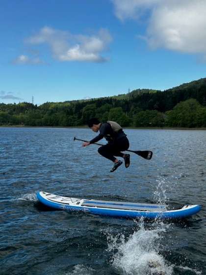 ボードの上も慣れてきました。こんなこともできるようになりました。水の中に落ちても、みんなと楽しくやっているので、寒くないです!