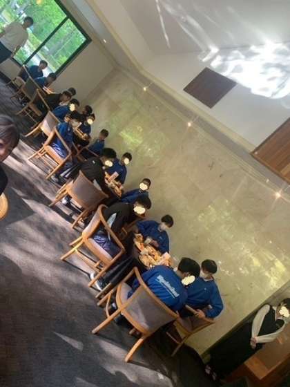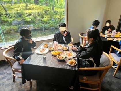 おはようございます。みんな元気に2日目を迎えました。睡眠もしっかり取りました。朝食の時間です。みんなと食べる朝食は、また格別ですね。普段よりもたくさん食べているかも・・・。今日の予定は、朝食後ラフティングを行います。
