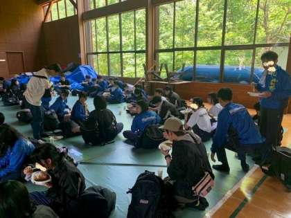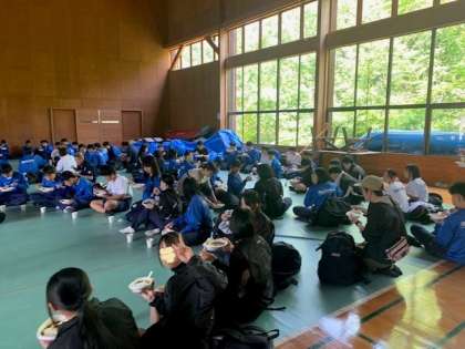 今日の昼食です。カレーライスです。おかわりも大丈夫です。みんなで輪になって食べています。