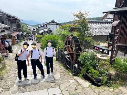 馬籠の宿場町をブラブラ。大阪とは違った風景に、ゆったりした気持ちになります。ここではお土産購入も可です。さあ、これからお家の人が待っている大阪、東三国に帰ります。