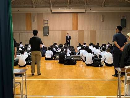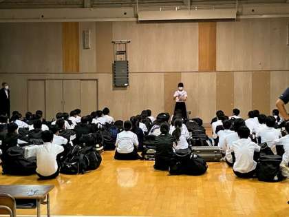 3年生、帰ってきました。予定より45分遅くなりました。格技室で実行委員の生徒の司会で帰校式が行われました。校長先生からご講評をいただき、お世話になった添乗員、カメラマン、看護師、の皆さんにお礼を伝えました。