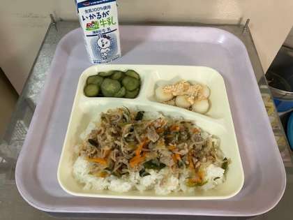 今日の給食は、豚丼、牛乳、きゅうりの梅風味、白玉だんご、きな粉(袋・白玉だんご)、です。