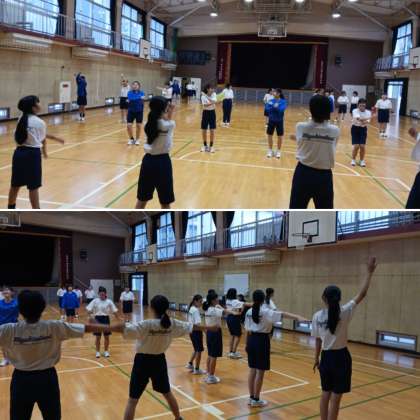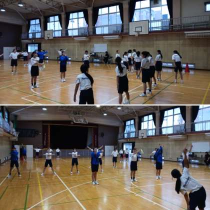 2年生の体育の授業の様子です。今日は「体操」の練習をしています。雨で体育館での授業でした。元気良く声を出して授業を受けています。