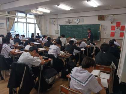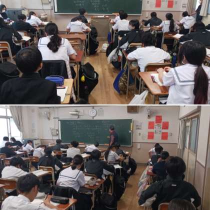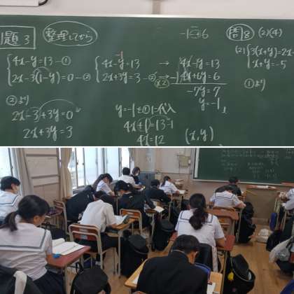 2年生の数学の授業の様子です。「連立方程式」について学習しています。1年生の方程式の応用ですね。練習問題の反復学習を頑張りましょう。