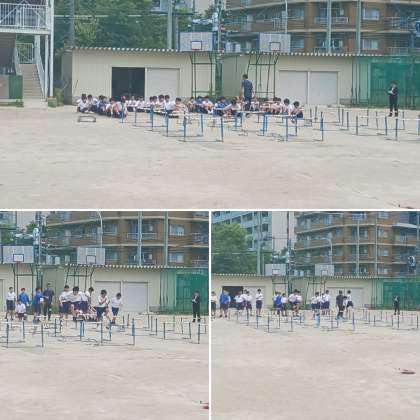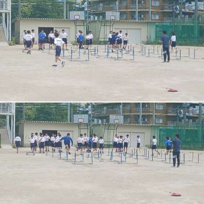 2年生の体育の授業の様子です。「ハードル走」をしています。先生から技術向上のためのアドバイスがありました。