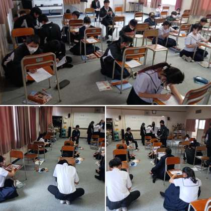 2年生の音楽の授業の様子です。「歌舞伎」についての学習です。映像や先生の話を聞き、歌舞伎についての知識の理解を深めています。