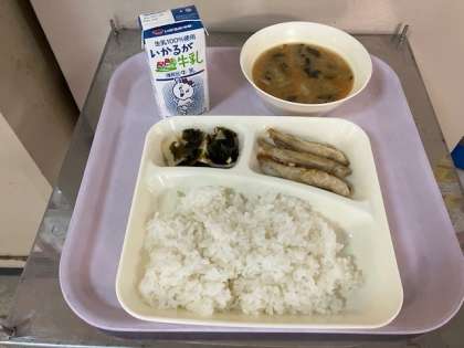 今日の給食は、ごはん、牛乳、きびなごてんぷら、みそ汁、わかたけ煮、です。