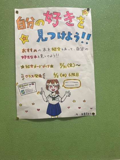 1年生は5・6時間目から、図書委員を中心とした読書紹介カード作りが始まりました。みんな、お気に入りの本を持ってきて紹介文作りに一生懸命取り組んでいました。本の魅力が伝わるカードに仕上げたいですね。