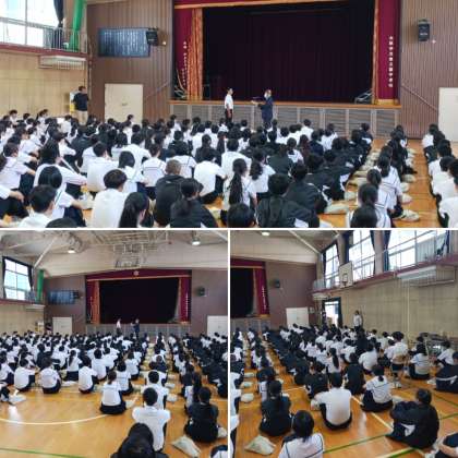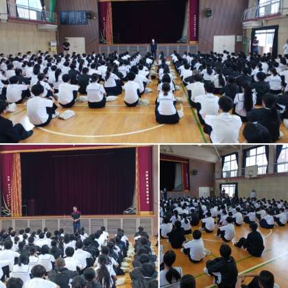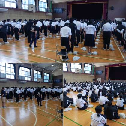 6月になりました。新学期が始まって、2か月が経ちました。今日も時間どおりに集合し開始ができました。陸上部の表彰の後、校長先生と生徒指導主事の先生から話がありました。