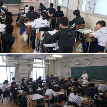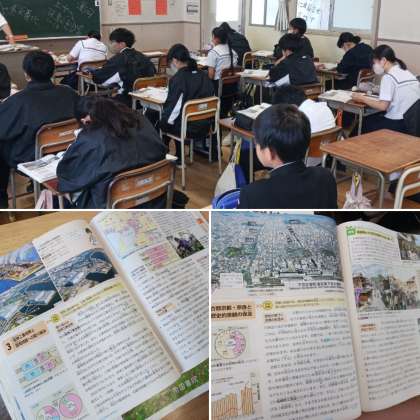 2年生の社会の授業の様子です。近畿地方の地理についての学習です。阪神工業地帯についての話がありました。覚えることが多いですね。