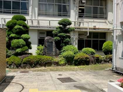 玄関を入ってすぐ左、理科室の裏手になります。石碑があります。周りの枝木を管理作業員さんが剪定してくれています。今日は天気もいいので、特に緑が映えています。