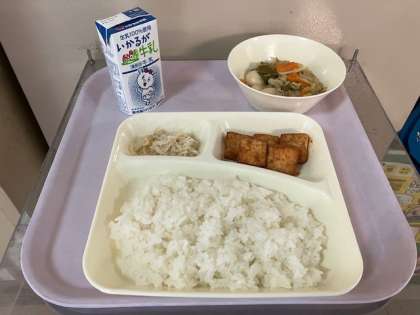 今日の給食は、ごはん、牛乳、八宝菜、あつあげのピリ辛じょうゆかけ、もやしの中華あえ、です。