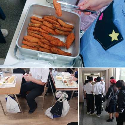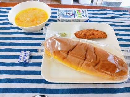 6月6日(木)の給食は、パンプキンパン、牛乳、サーモンフライ、豆乳スープ、きゅうりのバジル風味サラダ、チーズ、です。