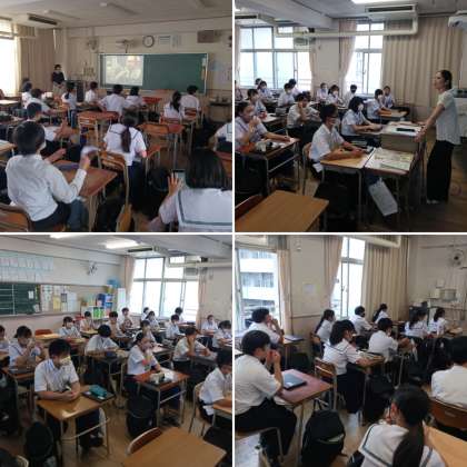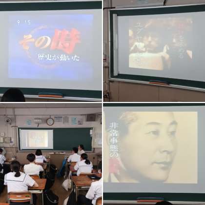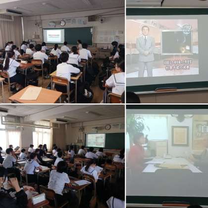 2年生の総合の授業の様子です。反戦平和学習を行っています。本時はDVDを視聴しています。来週以降、今日の内容を発展して学習していきます。