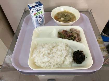 今日の給食は、ごはん、牛乳、豚肉の梅風味焼き、五目汁、のりのつくだ煮、です。