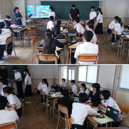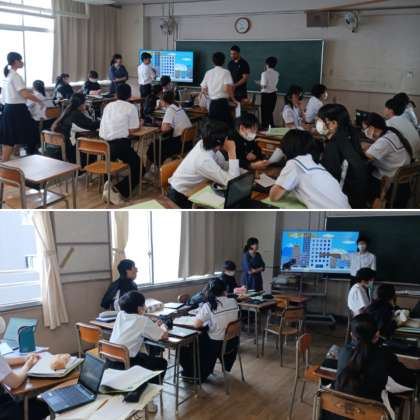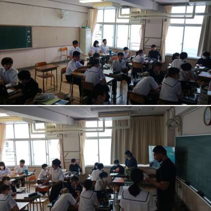 2年生の英語の授業の様子です。今日ははC-NET(Osaka City Native English Teacher)の授業です。英語でのコミュニケーション能力をつけるために、ゲームやスピーキングの練習をして上達を図っています。