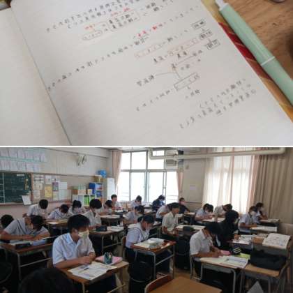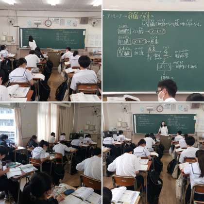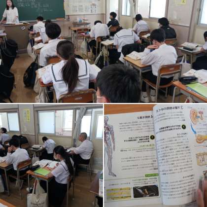 2年生の理科の授業の様子です。生物分野の学習です。臓器の働きについて先生から説明がありました。体内の不要な物質がどう運ばれるか説明がありました。