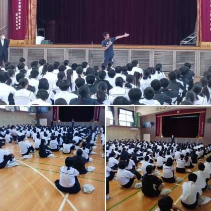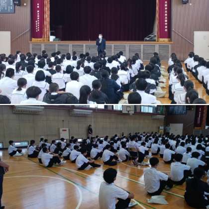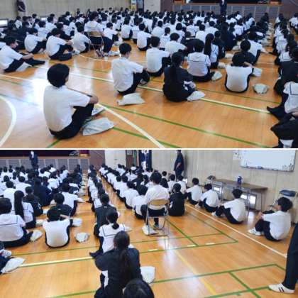 全校集会の様子です。今日の集会でも、クラブ活動で活躍した人の表彰がありました。校長先生の話の後、生徒指導主事の先生から交通ルールの話がありました。