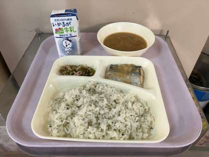 今日の給食は、菜飯、牛乳、みそ汁、さごしのおろしじょうゆかけ、野菜いため、です。